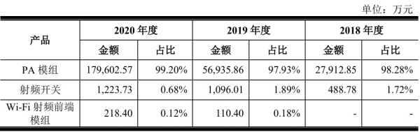 2020 年,PA 模组业务收入占唯捷创芯营收的 99.20%,射频开关和 Wi-Fi 射频前端模组业务收入占比分别为 0.68% 和 0.12%。