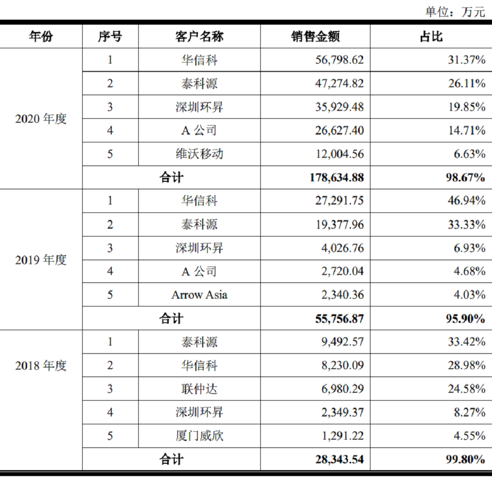 华信科、泰科源和深圳环在 2018 年-2020 年一直是唯捷创芯的前五大客户。唯捷创芯业务较为集中,2018 年-2020 年,前五大客户销售金额占总营收比例分别为 99.80%、95.90% 和 98.67%。