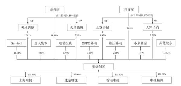 荣秀丽直接持有唯捷创芯 14.80% 股份,通过天津语捷与天津语腾间接控制公司 9.39% 的股份;孙亦军直接持有唯捷创芯 3.05% 股份,并通过北京语越和天津语尚间接控制公司 11.05% 股份。双方一共持有 38.29% 的公司股份,是唯捷创芯的实际控制人。