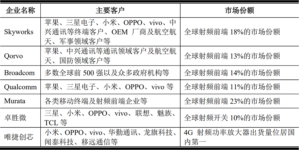 从整个市场来看,唯捷创芯的主要竞争对手有 Skyworks、Qorvo、Broadcom、Qualcomm、Murata 和卓胜微等公司。与同行业内的龙头企业相比,唯捷创芯在营收规模、客户覆盖范围、市场份额等方面仍有一定差距。但是在国内,唯捷创芯拥有较高的射频功率放大器市场份额,其 4G 射频功率放大器出货量位居国内第一。