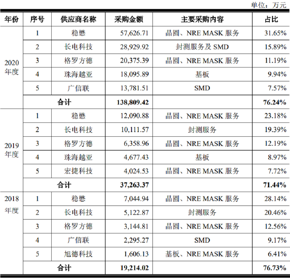 ▲唯捷创芯 2018 年-2020 年前五大供应商