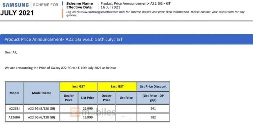 三星 Galaxy A22 5G 手机将于 8 月份在印度发布。据外媒 91mobiles,零售渠道透露的信息称,该机 6GB+128GB版的售价为 19999 印度卢比(约 1733.91 元人民币),而 8GB+128GB版的售价为 21999 印度卢比(约 1907.31 元人民币)。