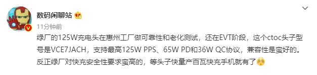 数码博主 @数码闲聊站 在 6 月份爆料,OPPO 的 125W 充电头正在惠州工厂做可靠性和老化测试,还在工程验证与测试阶段(EVT,Engineering Verification Test)。