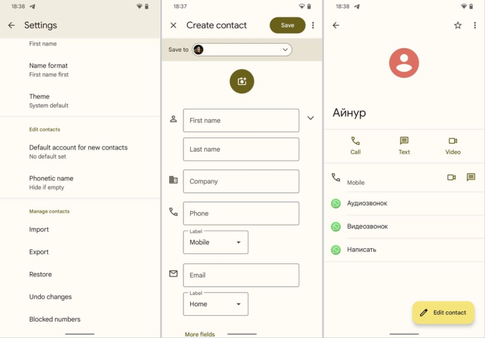如上图所示,谷歌通讯录的整个界面风格都是黄棕配色,这些强调色都是根据壁纸自动生成的。此外,搜索栏和添加新联系人按钮也进行了更改。