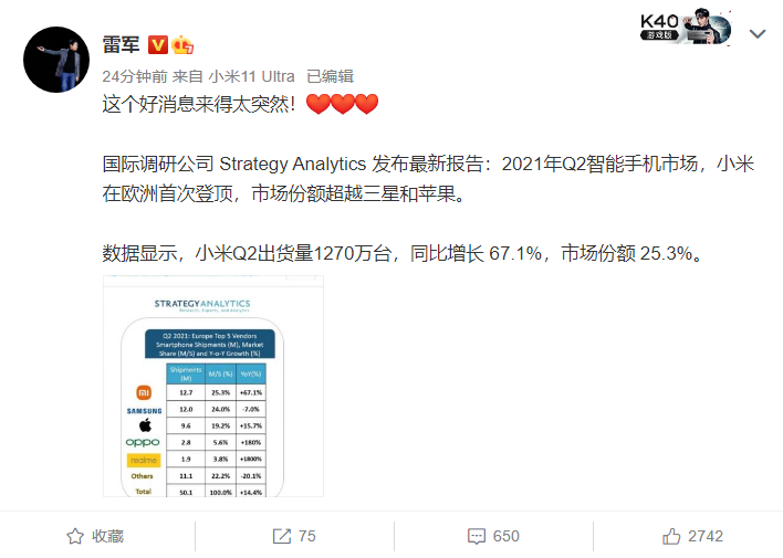 今天早上,小米 CEO 雷军表示,国际调研公司 Strategy Analytics 发布最新报告:2021 年 Q2 智能手机市场,小米集团在欧洲首次登顶,市场份额超越三星和苹果。数据显示,小米 Q2 出货量 1270 万只,同比增长 67.1%,市场份额 25.3%。