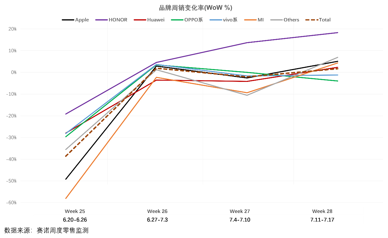 虽然市场大盘持续低位震荡,但部分品牌表现依旧亮眼。赛诺指出,电商节大促之后大盘迅速下滑,第25周市场整体降幅接近40%,所有品牌无一幸免,第25到28周,单周销量始终在六百万以下徘徊,OPPO和vivo线下优势明显,而荣耀正快速提升成为目前唯一保持快速增长的品牌。周度市场增速方面,OPPO和vivo两个品牌的变化与整体市场平均变化基本保持一致;荣耀在50系列上市后始终保持着超过大盘的增长势头,第28周更是取得接近20%的增长率。
