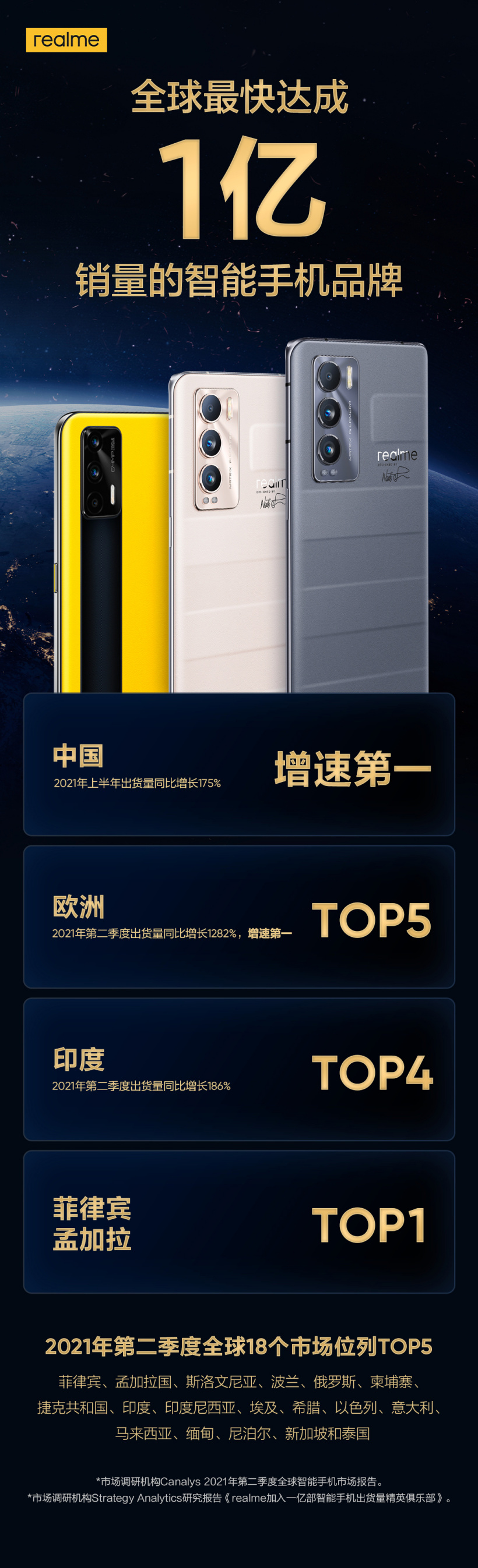 realme 真我手机品牌已经成立 3 年,此前的统计结果显示该品牌智能手机全球销量已经突破 1 亿台,成为了全球最快达到这一目标的手机品牌。今日 realme 官方又表示,根据市场研究机构 Canalys 最新统计数据,realme 真我手机 2021 年第二季度,出货量在全球 18 个市场位列 Top 5。