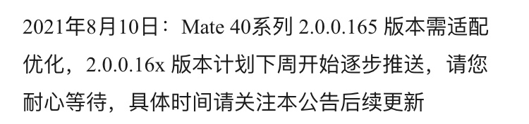华为上周表示,Mate 40 系列鸿蒙HarmonyOS2.0.0.165 版本需适配优化,计划本周开始逐步推送。