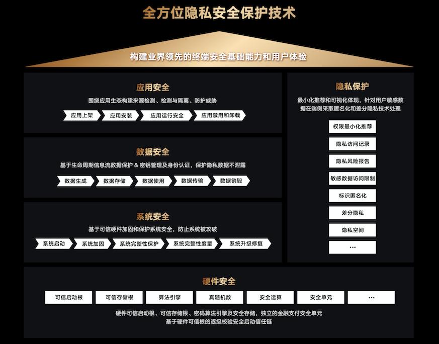 除此之外,双TEE系统通过由内到外、软硬协同以及由端到云的理念实现全面贯通,提供从硬件、系统、应用到云的端到端安全保护包括硬件芯片、可信执行环境、系统内核、数据、应用、网络、互联、服务的安全以及隐私保护,确保数据不被恶意覆写或篡改,提供可信的执行环境,在“应用安全”、“数据安全”、“系统安全”、“隐私保护”、“硬件安全”等全维度构建业界领先的终端安全基础能力和用户体验。