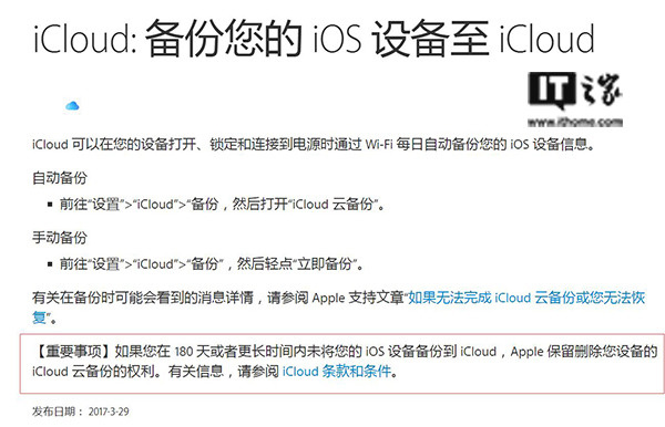 报告称,“如果一个设备在 180 天内没有备份到 iCloud,苹果公司保留删除该 iCloud 云备份的权利。”