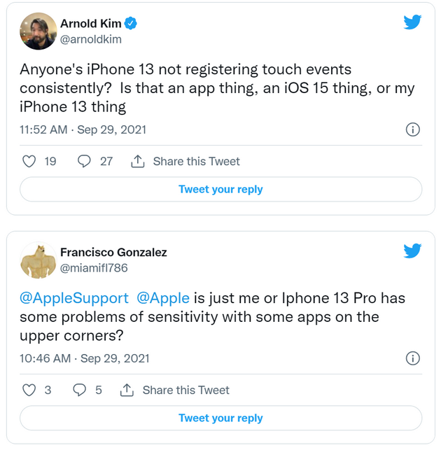在Reddit、MacRumors论坛、Twitter和苹果支持部门的帖子中,有不少关于iPhone 13用户在新手机上出现触控失灵问题的报告。用户还报告了轻触唤醒的问题,即轻触屏幕唤醒后,iPhone没有反应,以及其他全系统和应用内触控输入没有反应的情况。