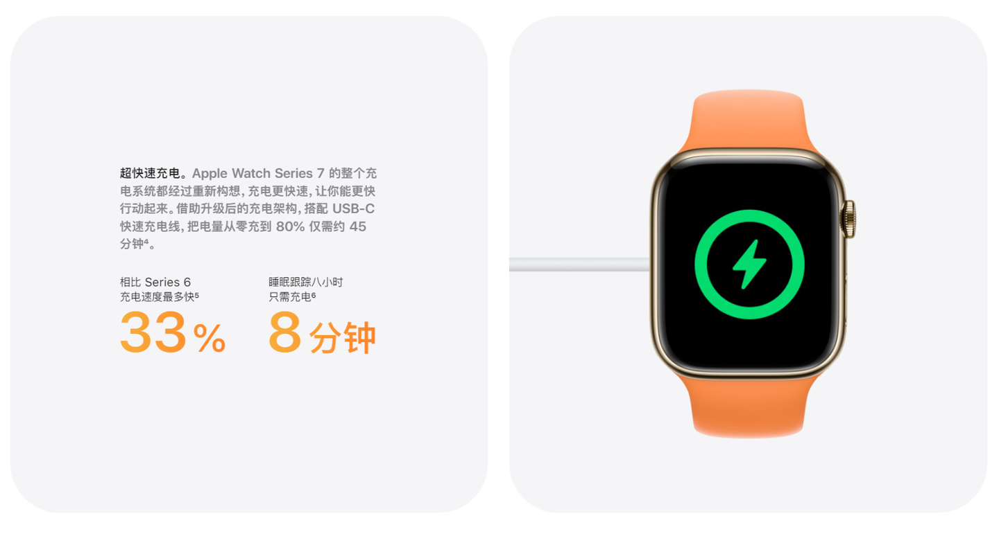 苹果 Apple Watch Series 7 智能手表已于昨晚开启预售,新手表的新功能之一是其快速充电功能,苹果公司称其充电速度提升 33%,能够在大约 45 分钟内将手表充电到 80% 左右的电量。