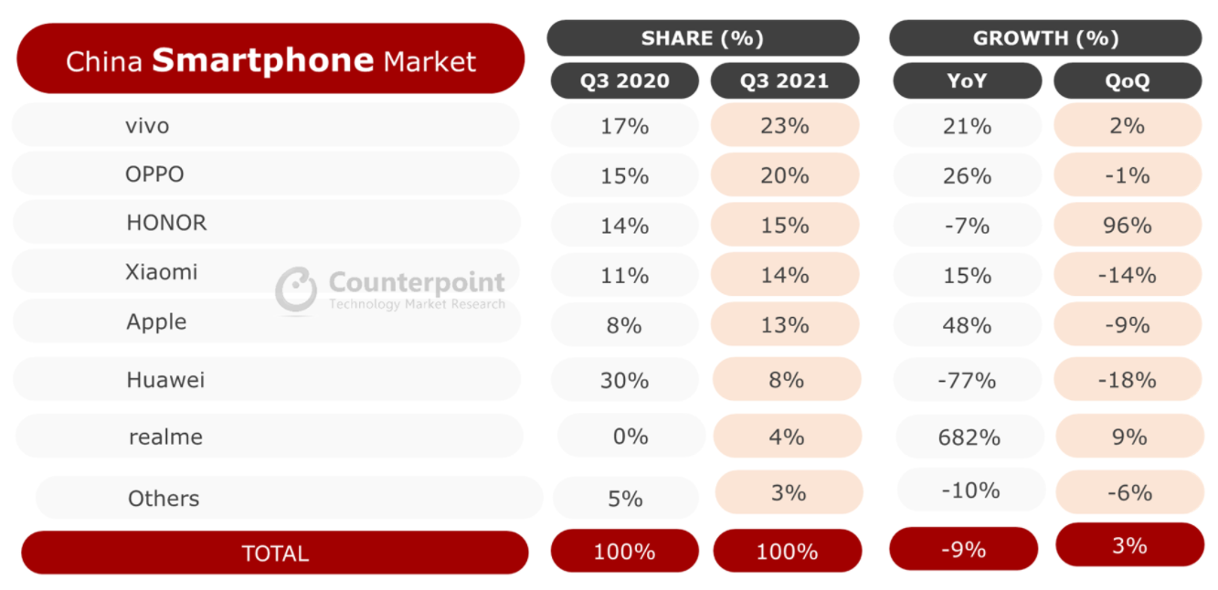 报告显示,2021 年第三季度,vivo 以 23% 的市场份额位居第一,OPPO 则以 20% 的市场份额排在第二位,荣耀(15%)和小米(14%)分列三、四位。