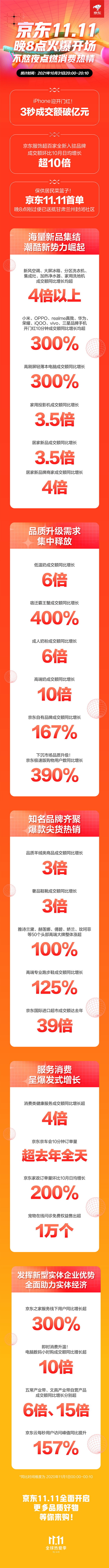 今年京东11.11从10月20日晚8点开启预售,预售商品种类同比增长超50%,离预售结束还有2天,就有59688个品牌预售期订单额同比增长超100%。