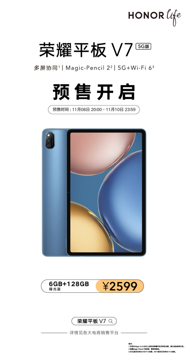 日前,荣耀平板V7 5G版迎来预售,提供6GB+128GB版本,售价2599元,将于11月11日正式开售。