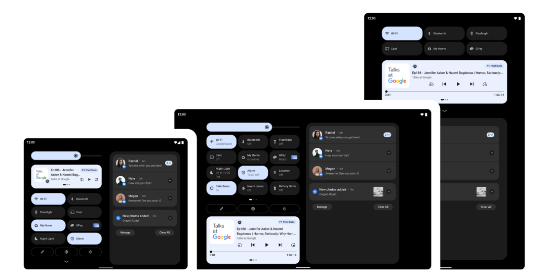 在 Android 12L 中,谷歌优化了大屏幕设备的 UI,包括通知、快捷设置、锁屏、概览、主屏幕等。例如,针对 600dp 宽度以上的屏幕,通知栏、锁屏和其他系统表面将采用新的两列布局,以充分利用屏幕区域。同时系统应用也得到了优化。