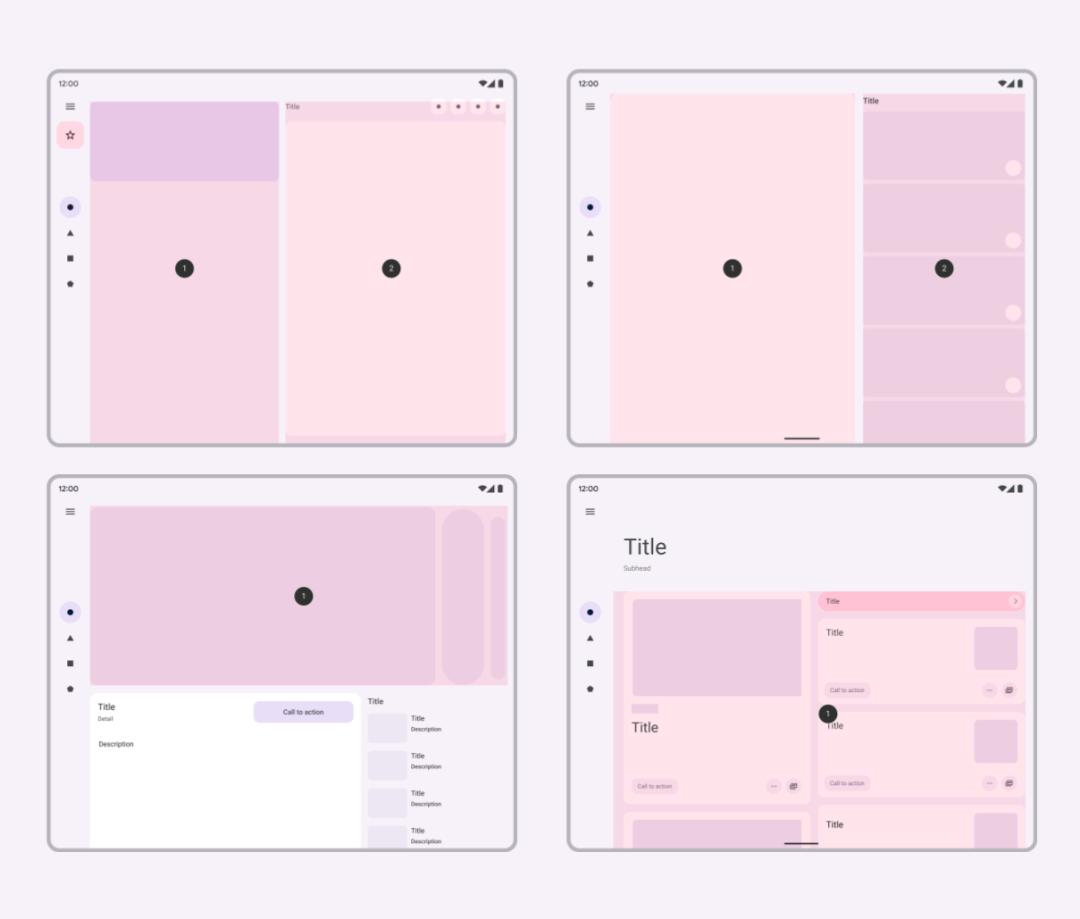 为了向用户提供最佳的导航体验,谷歌希望开发者提供针对用户设备窗口尺寸类量身定制的导航界面。推荐的导航模式包括适用于紧凑屏幕的导航栏,以及适用于中等屏幕宽度的设备类和更大屏幕设备 (600dp 以上) 的导航栏。对于屏幕更宽的设备,Material Design 指南中提出了几个有关大屏幕布局的方案,例如可以使用 SlidingPaneLayout 来实现列表/细节结构。