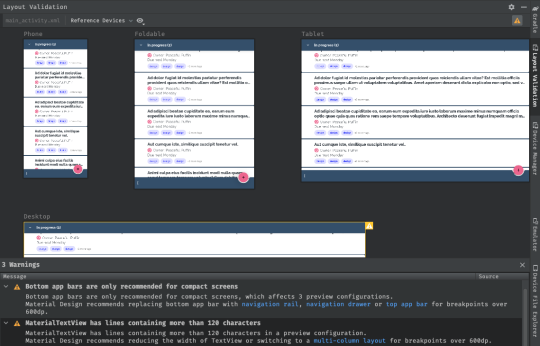 此外,谷歌正在 Android Studio Chipmunk 中开发一个新的可视化的 lint 工具,用于在布局验证中主动显示 UI 提醒和建议,包括哪些参考设备会受到影响。