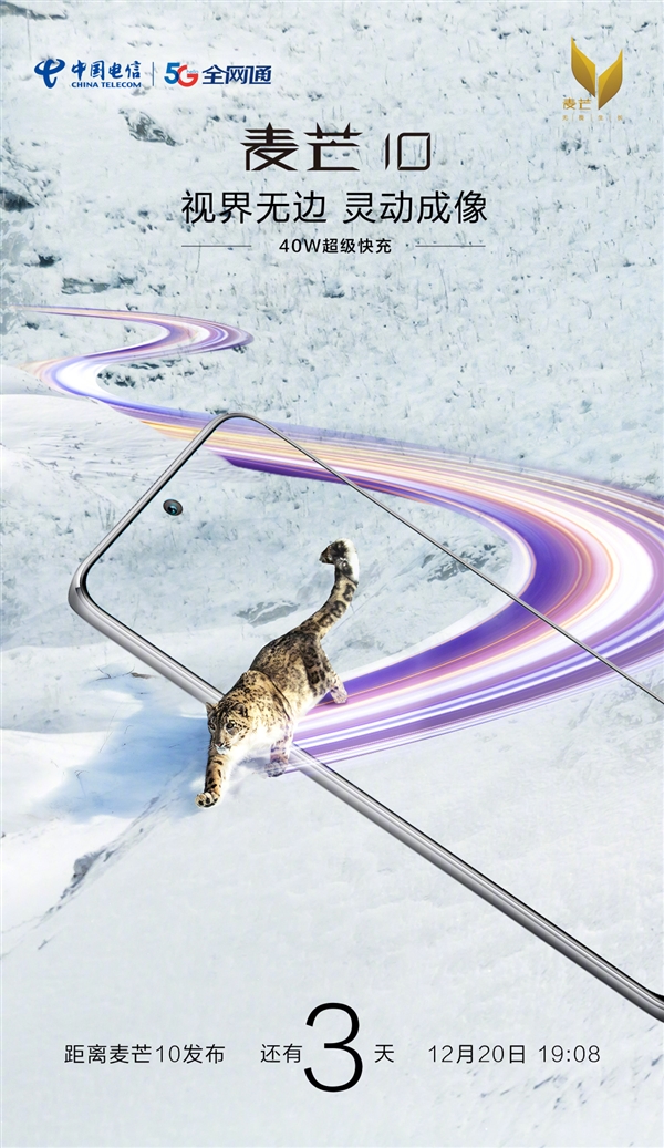 今日,天翼终端官微宣布,将于12月20日晚19:08举行新品发布会,正式发布麦芒10新机,从预热海报来看,该机正面将采用居中挖孔前摄的设计,同时还支持40W超级快充。