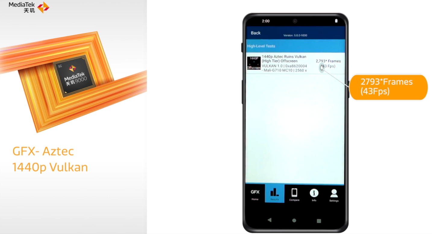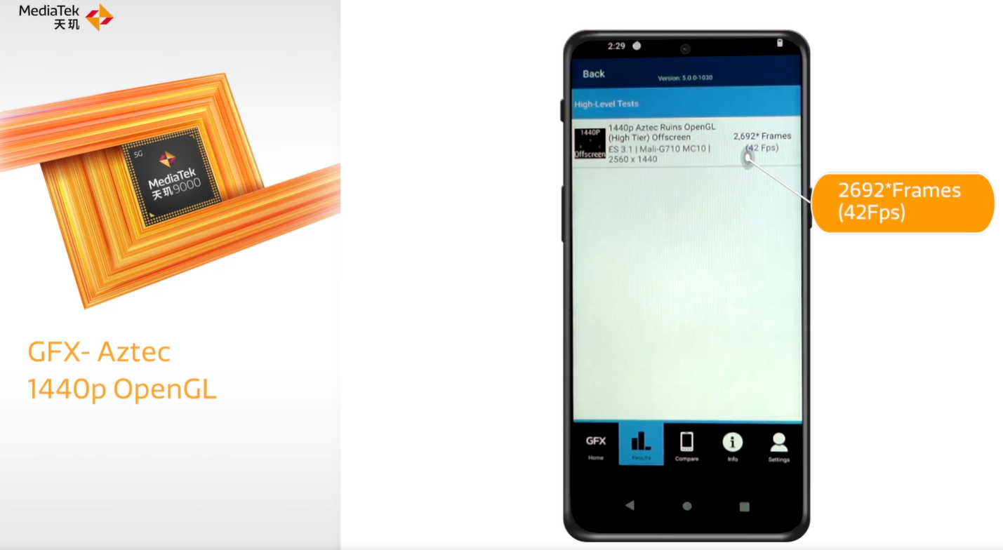 天玑 9000 在 Aztec Ruins OpenGL (High Tier) Offscreen(1440p)下测试为 42Fps,骁龙 8 Gen 1 为 43Fps。