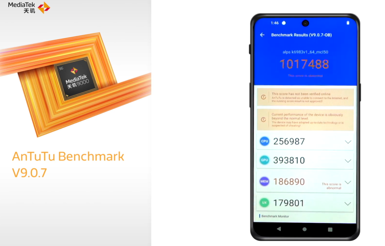 天玑 9000 在 AnTuTu 9.0.7 版本跑分 1017488,CPU 得分 256987,GPU 得分 393810,MEM 得分 186890,UX 得分 179801。