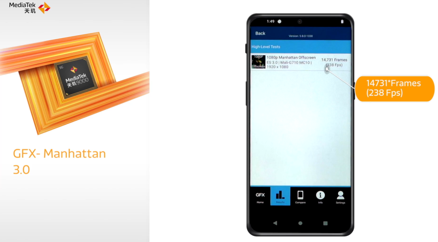 而到了图形测试,天玑 9000 的 GFX-Manhattan 3.0 测试 Offscreen(1080p)为 238 Fps,骁龙 8 Gen 1 为 267 Fps,骁龙 888 工程机测试为 169 Fps。