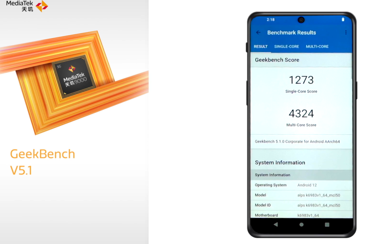 接下来看 GeekBench 5 跑分,天玑 9000 在 GeekBench 5.1 下单核跑分 1273,多核跑分 4324。