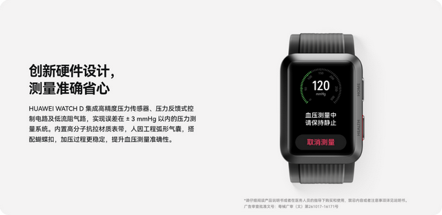 华为WATCH D采用创新硬件设计,集成高精度压力传感器、压力反馈式控制电路及低流阻气路,实现误差在±3mmHg 以内的压力测量系统,并内置高分子抗拉材质表带,人因工程弧形气囊,搭配蝴蝶扣,加压过程更稳定,提升血压测量准确性。