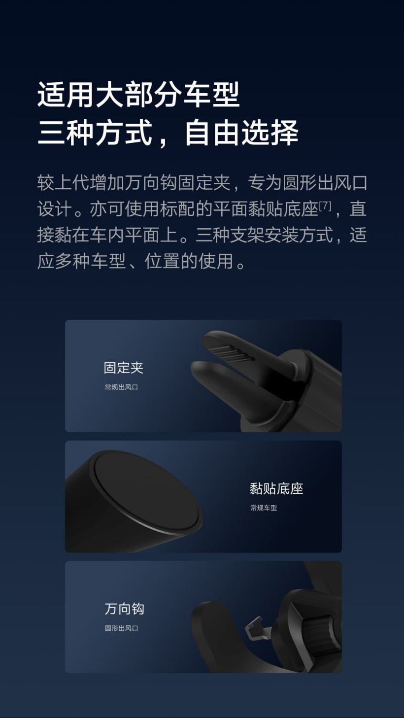 这款充电器采用三角形结构设计,即使处于颠簸路面,手机也不会晃动。夹臂张开后可达 84mm,因此大屏、小屏都适用。充电有效感应达 4mm,手机带壳也能充。