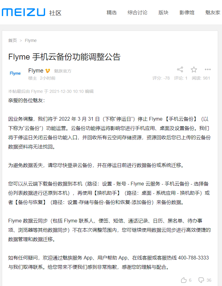 今天上午 Flyme 官方在魅族社区发布《Flyme 手机云备份功能调整公告》,称将于 2022 年 3 月 31 日(下称“停运日”)停止 Flyme 【手机云备份】(以下称为“云备份”)功能运营。