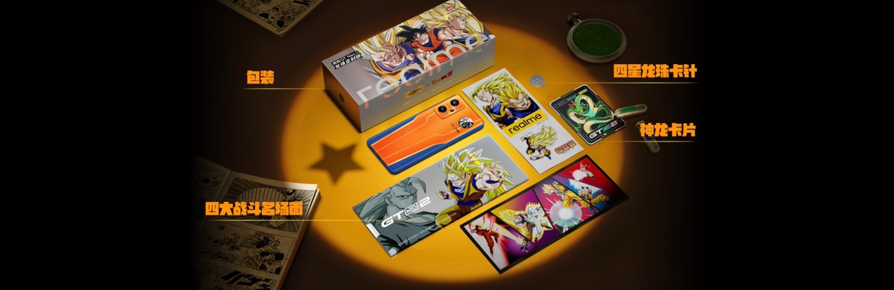 作为联名定制版产品,在整个包装上也进行了诚意十足的定制。包装盒外部印制了悟空不同战斗形态,到手的那一刻,就能感受到战斗力爆表的超级赛亚人设计。在包装内,也绘制了改变悟空人生的四场关键战役,彰显了悟空遇强则强的战斗精神和不断超越自我的成长蜕变,而这与realme敢越级的品牌精神十分契合。随机附赠,经典的龙珠四星球卡针,以及随机附赠的龙珠贴纸、神龙卡等定制版专属配件,都喻示着这是一款热血共筑的诚意之作。