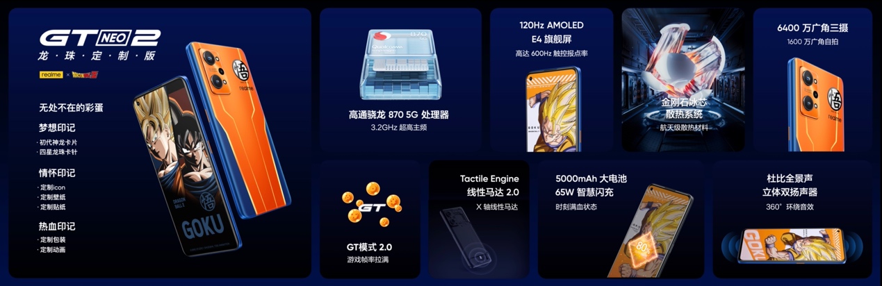 对于绝大部分80、90后来说,《龙珠》承载了太多童年的回忆。提及悟空、贝吉塔、龟仙人、弗利萨等一系列名字,总会让人回忆起那些热血的青春。作为一款联名产品,真我GT Neo2龙珠定制版在延续真我GT Neo2产品基因的前提下,将龙珠世界中孙悟空变身超级赛亚人的不同形态融入到产品外观及系统主题UI的设计中,成功打造手机圈的“超级赛亚人”。