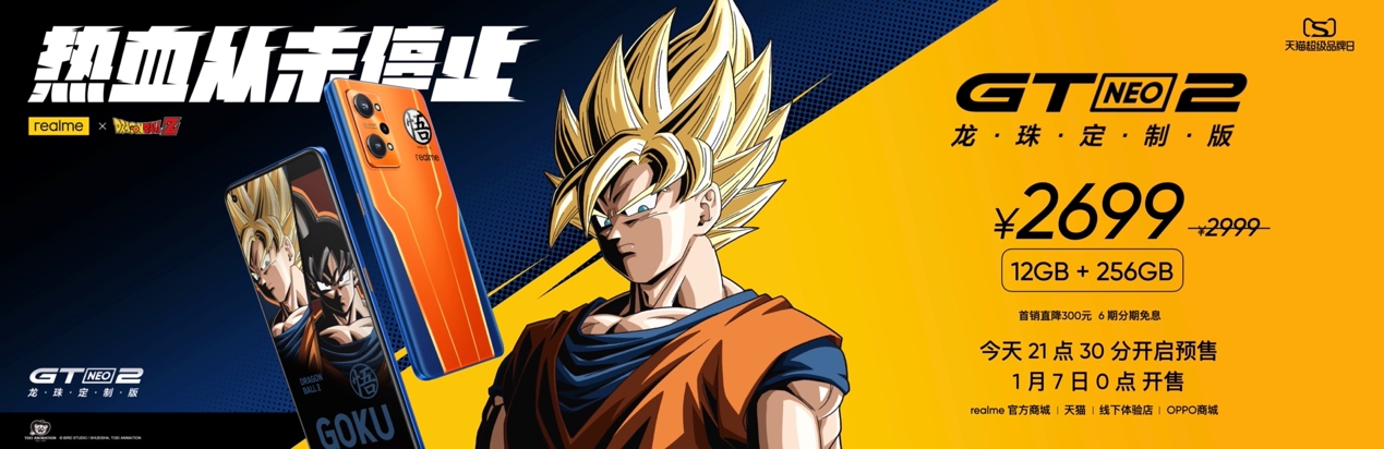 真我GT Neo2龙珠定制版售价在此次发布会上同步揭晓,12GB+256GB 售价2999元,首销直降300元,仅售2699元。并且还支持6期分期免息。同时,在1月4日至15日期间,打开淘宝搜索“热血从未停止”,解锁专属龙珠的隐藏彩蛋。