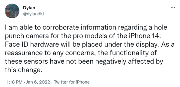 现在,消息越传越离谱,近日有传言称iPhone 14 Pro将采用药丸屏设计。该消息来自爆料人士DylanDKT,他称iPhone 14 Pro系列的前置摄像头将采用药丸状的打孔设计,Face ID则放在显示屏下。