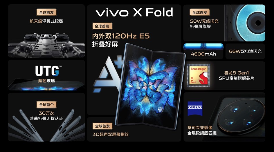 据了解,vivo X Fold采用航天级浮翼式铰链,仅铰链就有174个零件组成,并采用液态金属、航空高强度钢等六重航空材料,在重量、强度、抗冲击等方面表现出色,可实现高达30万次的折叠。同时,vivo X Fold在铰链中采用了浮动中板设计和UTG超韧玻璃等,极大改善了屏幕折痕,让vivo X Fold在屏幕平整度方面领先其他折叠屏手机。除了在铰链方面的突破,vivo X Fold还在多个方面展现强大的创新实力,实现了全球首发双120Hz E5屏幕、全球首发3D超声双屏幕指纹、折叠屏全球首发50线闪充等诸多在全世界首次亮相的技术。