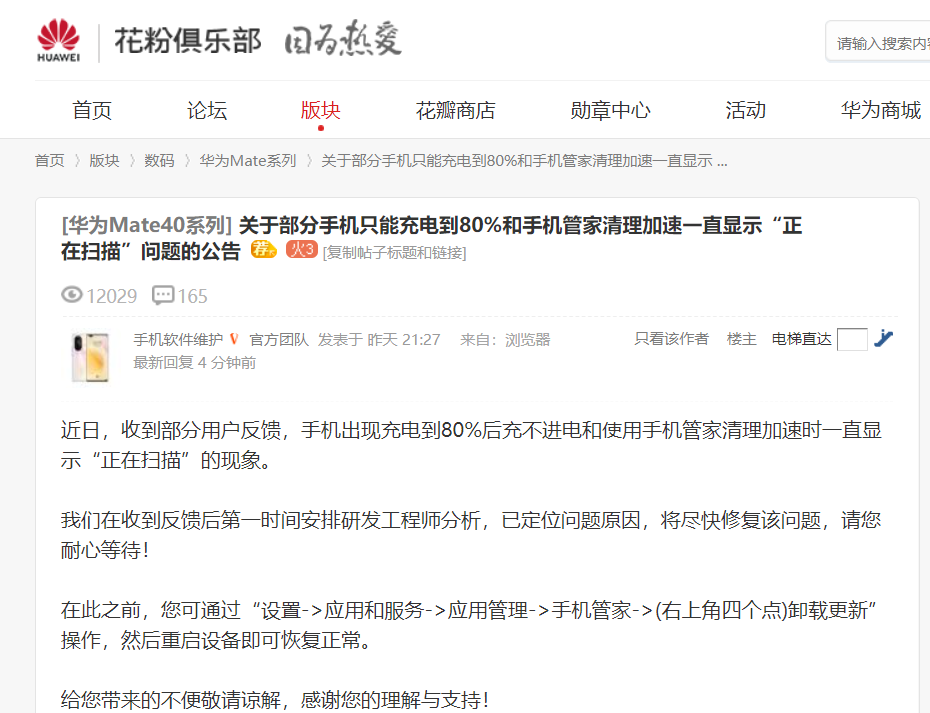 华为昨日晚间在花粉俱乐部 Mate 40 系列版块下发布公告,近日,收到部分用户反馈,手机出现充电到 80% 后充不进电和使用手机管家清理加速时一直显示“正在扫描”的现象。
