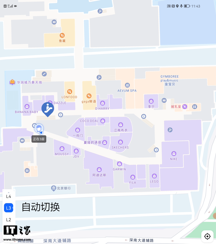 在商业中心等室内环境中,用户只要打开高德地图 App,用手指放大首页即能进入该中心的室内地图界面。如果用户在移动过程中涉及到上下楼,即能通过华为 3D 精准室内定位技术,智能识别用户所在楼层,自动切换、展示相应的室内地图界面。