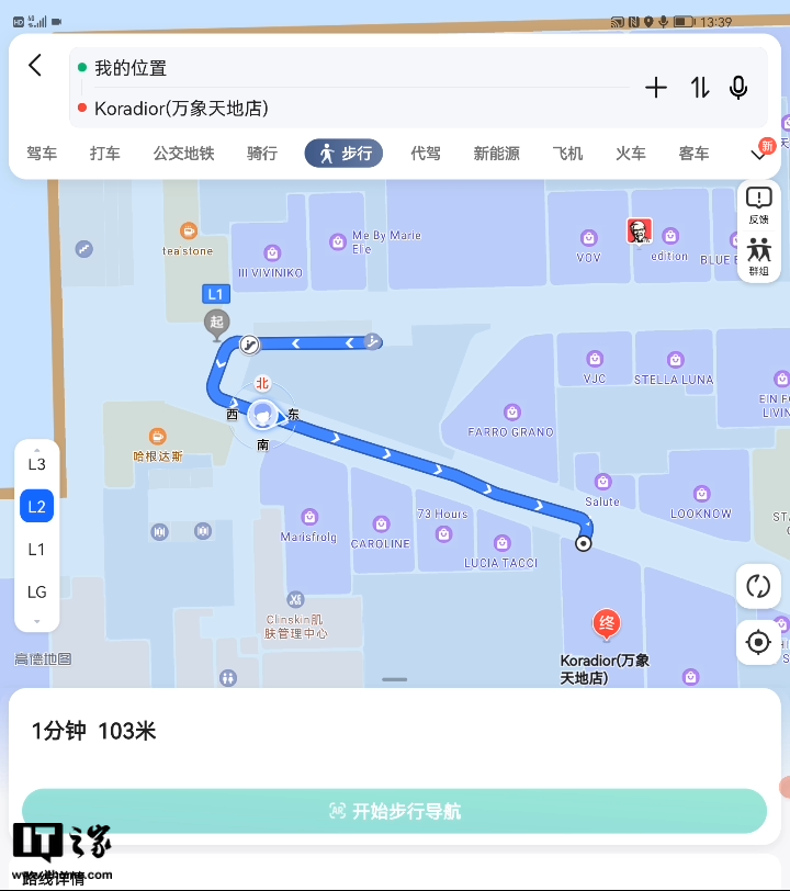 此外,用户可以进行更为清晰的室内步行路线规划:例如从当前所在精确位置,前往商业中心内的某家店铺,高德室内地图可以直观显示途中的店铺、出入口、电梯等丰富信息。而一旦在前往过程中涉及上下楼,高德也会根据实时定位,自动切换至相应楼层的界面。
