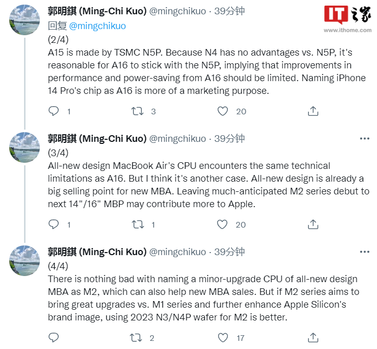 郭明錤还谈到了 MacBook Air 产品线,称全新设计的 MacBook Air 的芯片也遇到了与 A16 相同的技术限制,不过新的 MacBook Air 还有新设计作为卖点,因此 M2 芯片留到下一代 MacBook Pro 亮相可能会更好,也就是 2023 年采用 N3 或者 N4P 工艺。