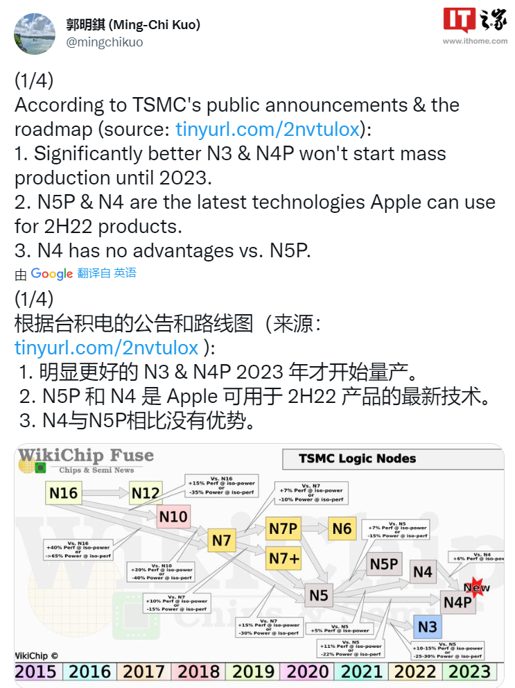 今日,天风国际分析师郭明錤在推特上回复该爆料,并放出了一张号称台积电发布时间的路线图,显示 N3 和 N4P 工艺 2023 年才开始量产,因此 iPhone 14 系列只能用 N5P 和 N4 工艺,而 N4 工艺相比 N5P 又没有明显提升,因此苹果 A16 选择 N5P 是比较合理的。
