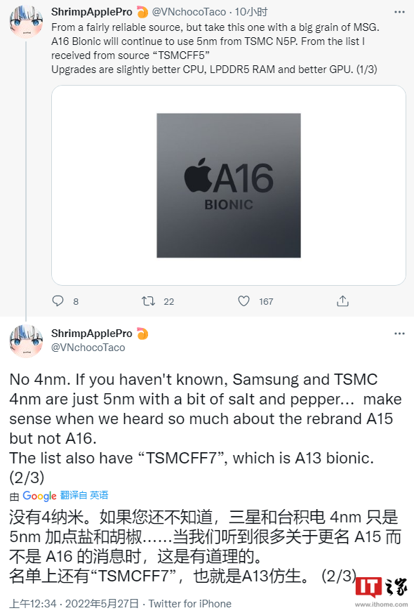苹果将在今年 9 月发布四款 iPhone 14 系列机型,爆料者(@ShrimpApplePro)此前表示他有“相当可靠的消息来源”称苹果 A16 Bionic 将采用台积电 5nm(N5P)工艺进行生产,而不是此前业界预估的 4nm,但新的一代 A16 依然会带来更好的 CPU、GPU 和 LPDDR5 RAM。
