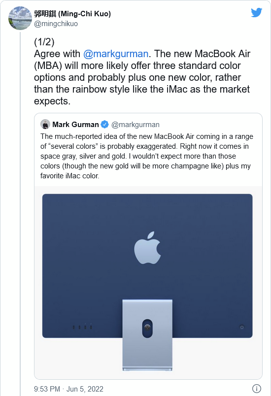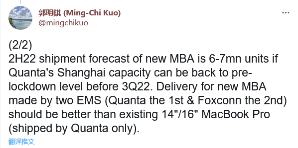 天风证券分析师郭明錤称,苹果对MacBook Air的更新可能在2022年下半年出货600万至700万台,他还认为该机型的颜色范围不会像之前声称的那样广泛。目前预计MacBook Air将在周一的WWDC 2022主题演讲中公布,该机型被认为会有比平常更多的颜色。