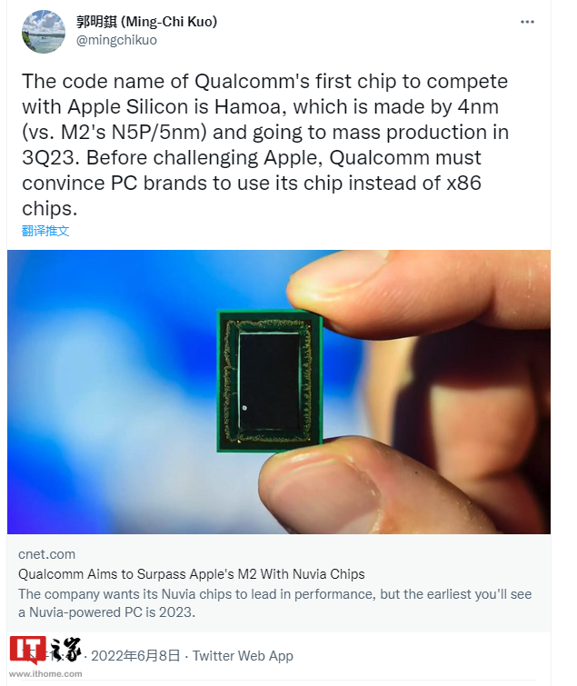 天风国际证券分析师郭明錤表示,高通将推出代号为 Hamoa 的芯片与苹果 Apple Silicon 芯片全力竞争。对比苹果 M2 采用台积电 5nm N5P 工艺,高通 Hamoa 芯片采用 4nm 工艺,预计 2023 年第三季度量产。