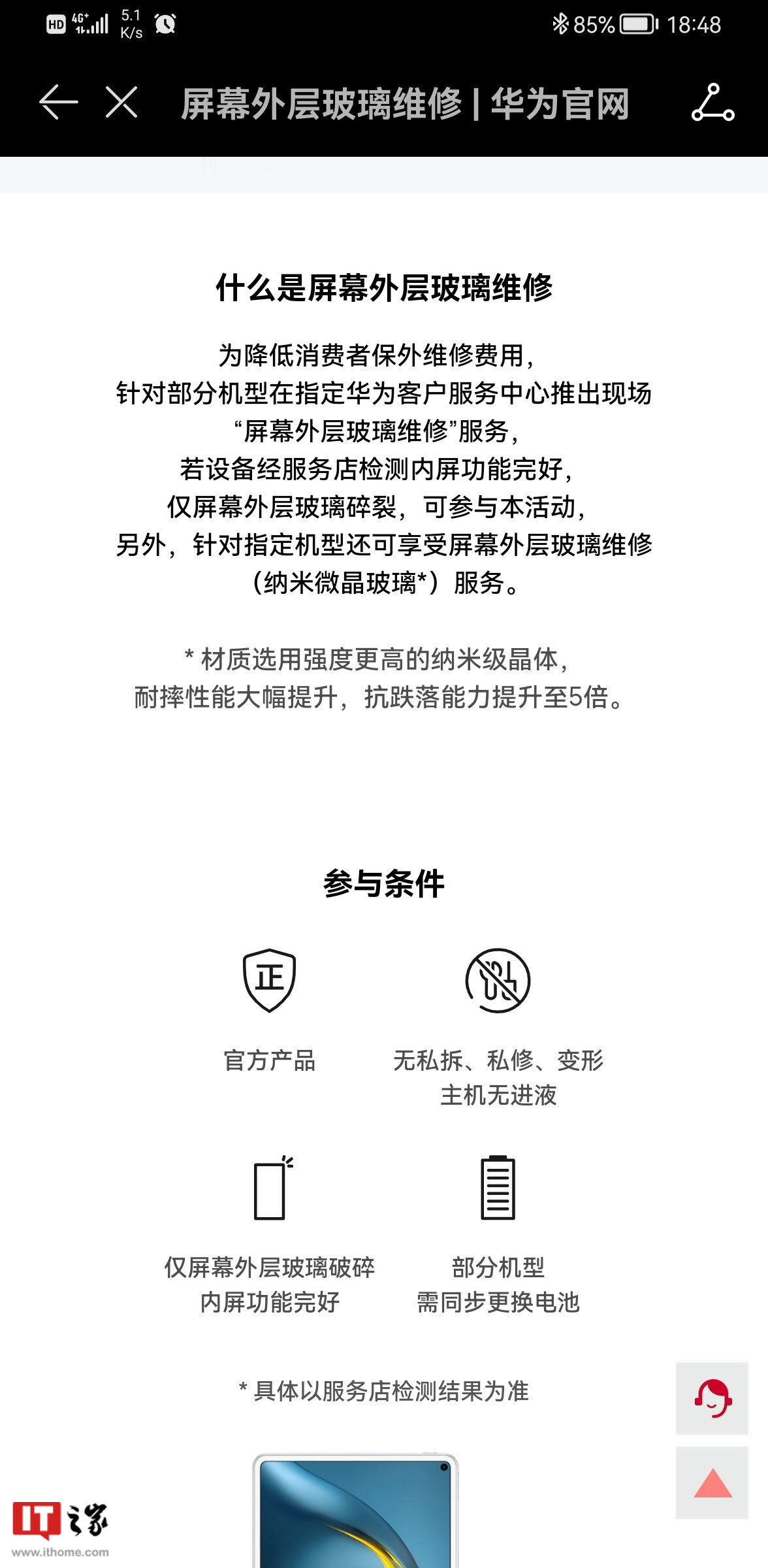 华为表示,受维修物料供应等限制,屏幕外层玻璃更换目前只能覆盖部分机型,后续将逐步覆盖更多机型,具体参与机型请以官方页面“参与产品型号及价格”查询为准。