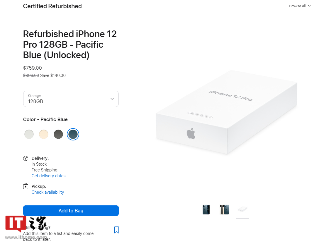 苹果的在线翻新商店目前提供 iPhone 12 Pro 翻新机型,提供 128GB、256GB 和 512GB 存储空间,拥有金色、银色、石墨色和海蓝色。今天下订单预计最早会在下周送达,Apple Store 指定门店支持店内取货。