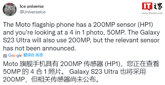IT之家了解到,主摄像头方面,此前 @UniverseIce 称,三星 Galaxy S23 Ultra 将采用 2 亿像素主摄,但该传感器尚未公布。但据 GsmArena 称,外界猜测 S23 Ultra 从当前型号的 108MP HM3 传感器(1 / 1.33“,0.8μm 像素)升级到 200MP 传感器(可能是 HP1,1/22”,0.64μm)。