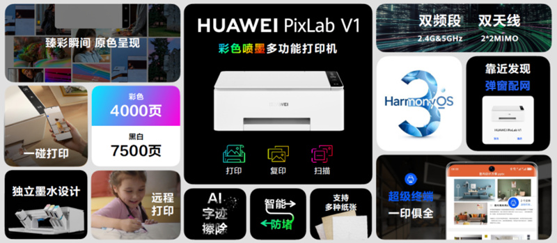 此次发布会上,华为正式发布了首款搭载HarmonyOS 3的彩色喷墨多功能打印机——华为PixLab V1。作为华为扩充打印机品类的产品布局带来的重磅产品,华为PixLab V1进一步完善了华为全场景智慧生活布局,丰富了输出设备,为消费者带来先进的彩色打印体验。