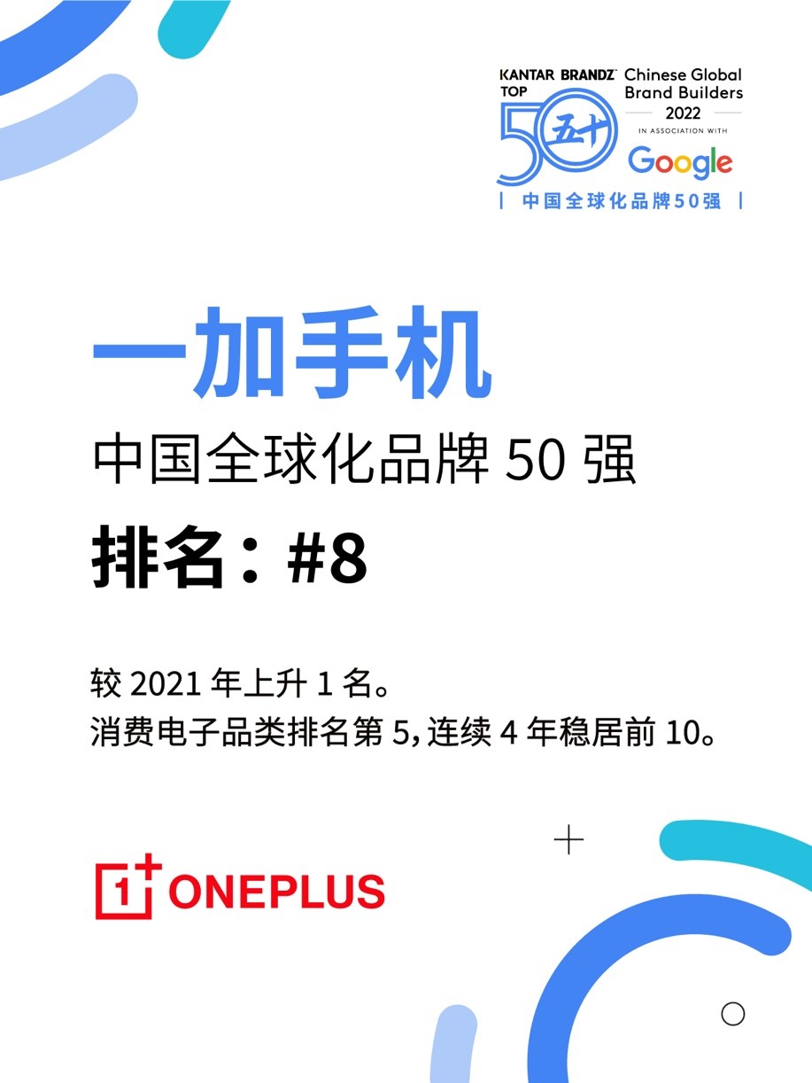2022年7月27日,凯度携手谷歌发布《2022凯度BrandZ?中国全球化品牌50强》。其中,一加手机排名第8,同时也在消费电子品类排名第5,总排名相较21年上升1名。凭借优质的产品体验和独特的品牌气质,一加手机已连续6年蝉联该榜单,且连续4年稳居前10。