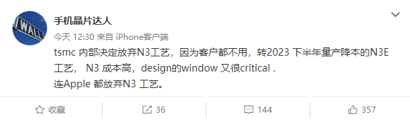 来自中国台湾芯片产业链的数码博主 @手机晶片达人 表示,台积电内部已经决定放弃 N3 工艺,因为客户几乎都不愿意用,包括苹果,发展方向将转向 2023 下半年量产的 N3E 工艺。据称,N3 成本高,N3E 更具性价比。