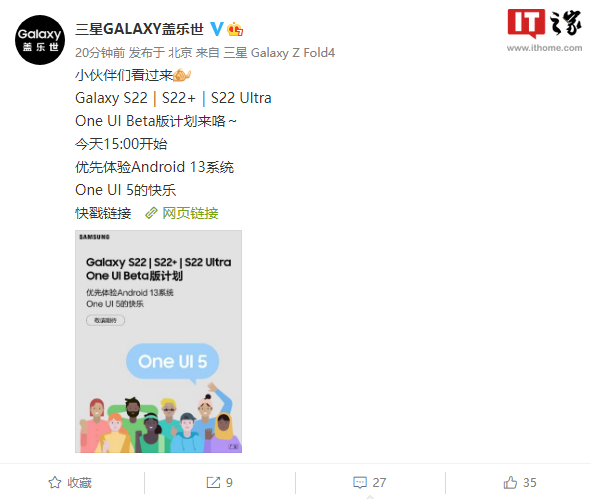 经过两次推迟后,据三星 GALAXY 盖乐世官微今日消息,三星 Galaxy S22、S22+、S22 Ultra 将于今天 15:00 开始 One UI 5 内测,该系统基于 Android 13。PS:这次应该不会推迟了吧。